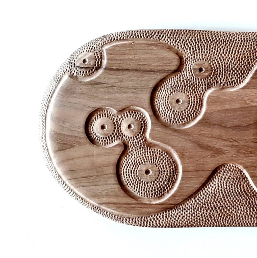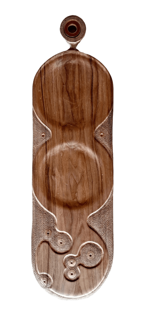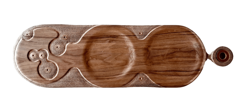 Plateau en noyer sculpté, anse incrustée en laiton.