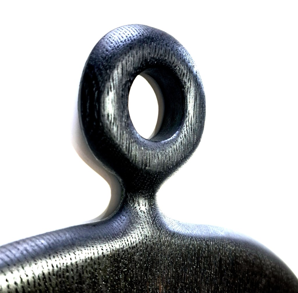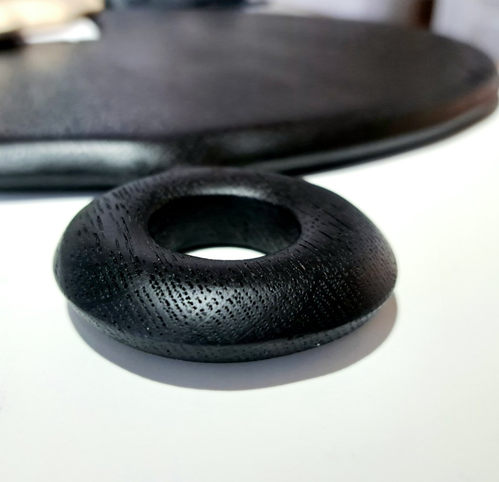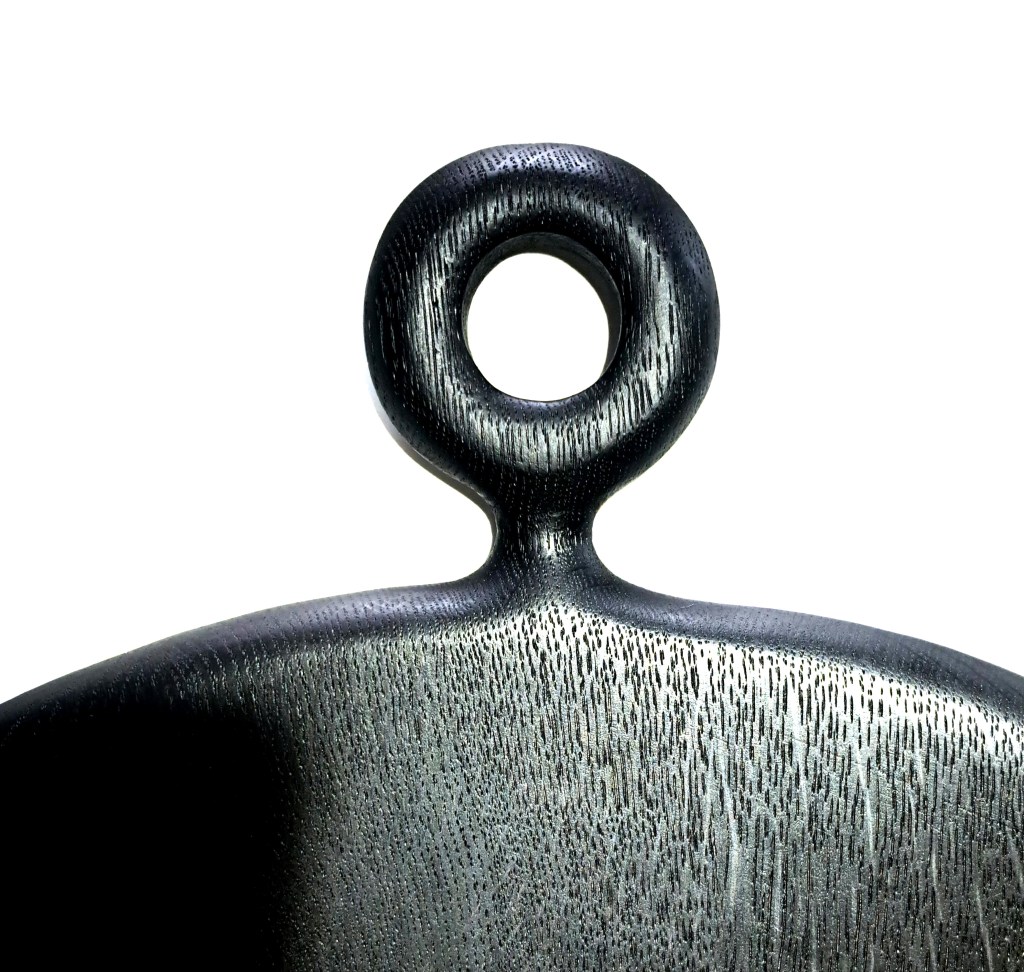 Planches en chêne massif brûlé, lien de cuir & laiton.