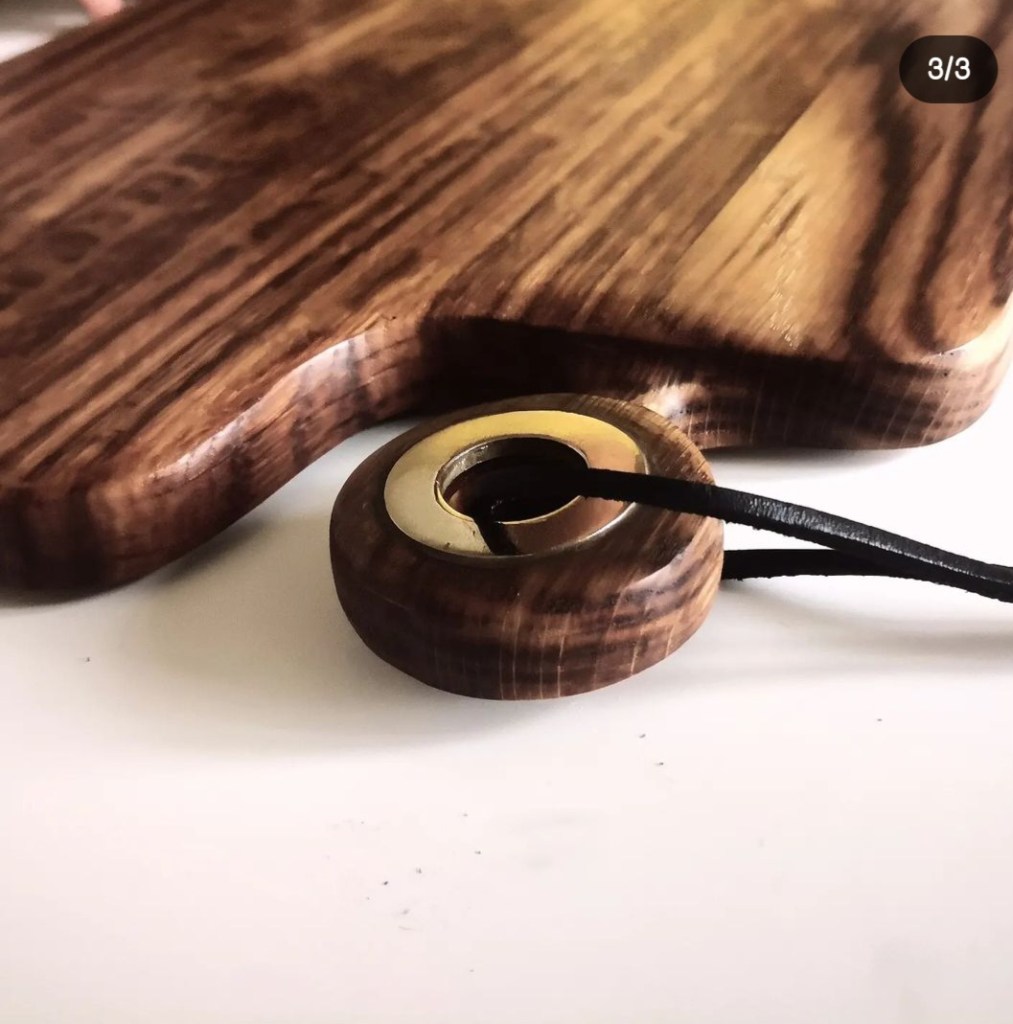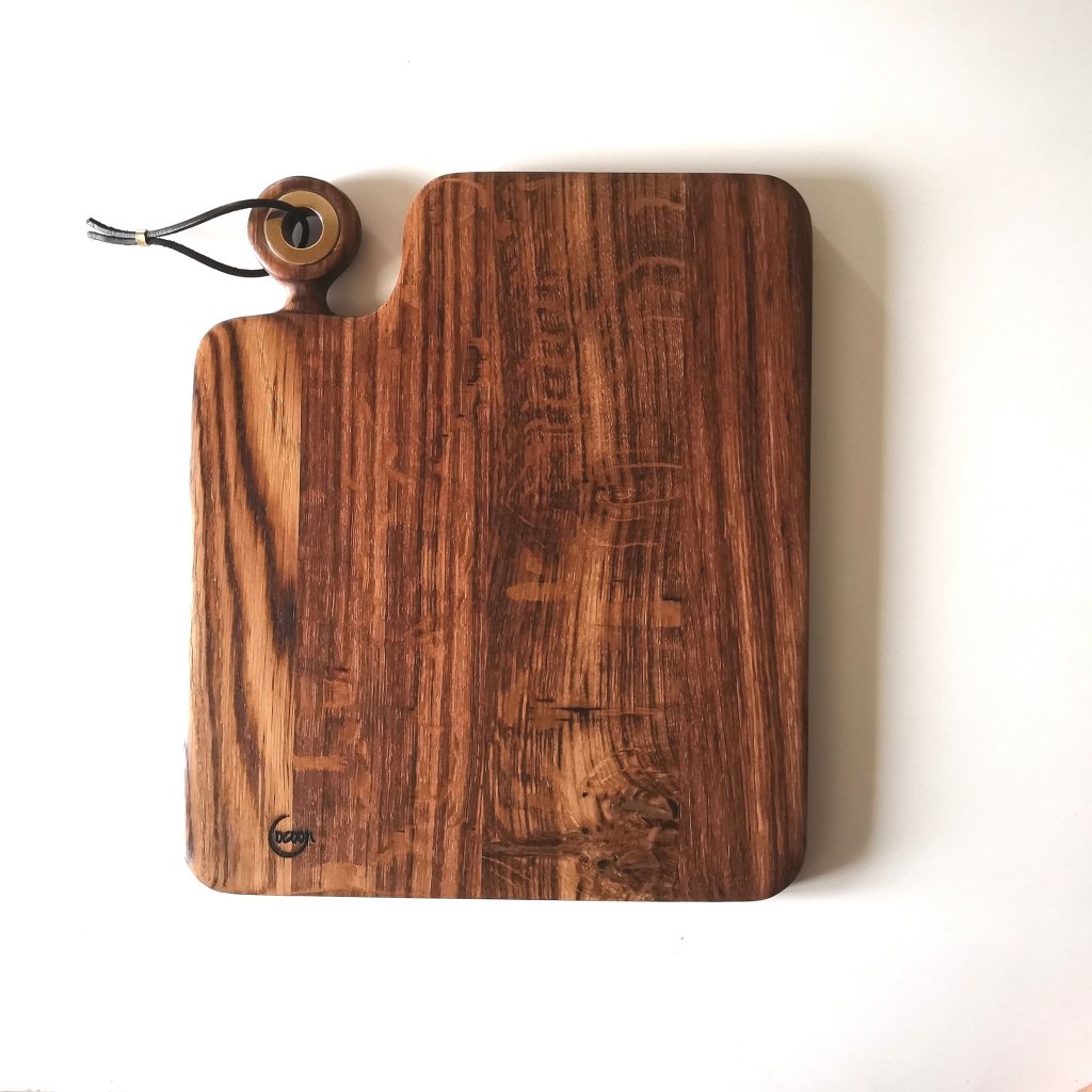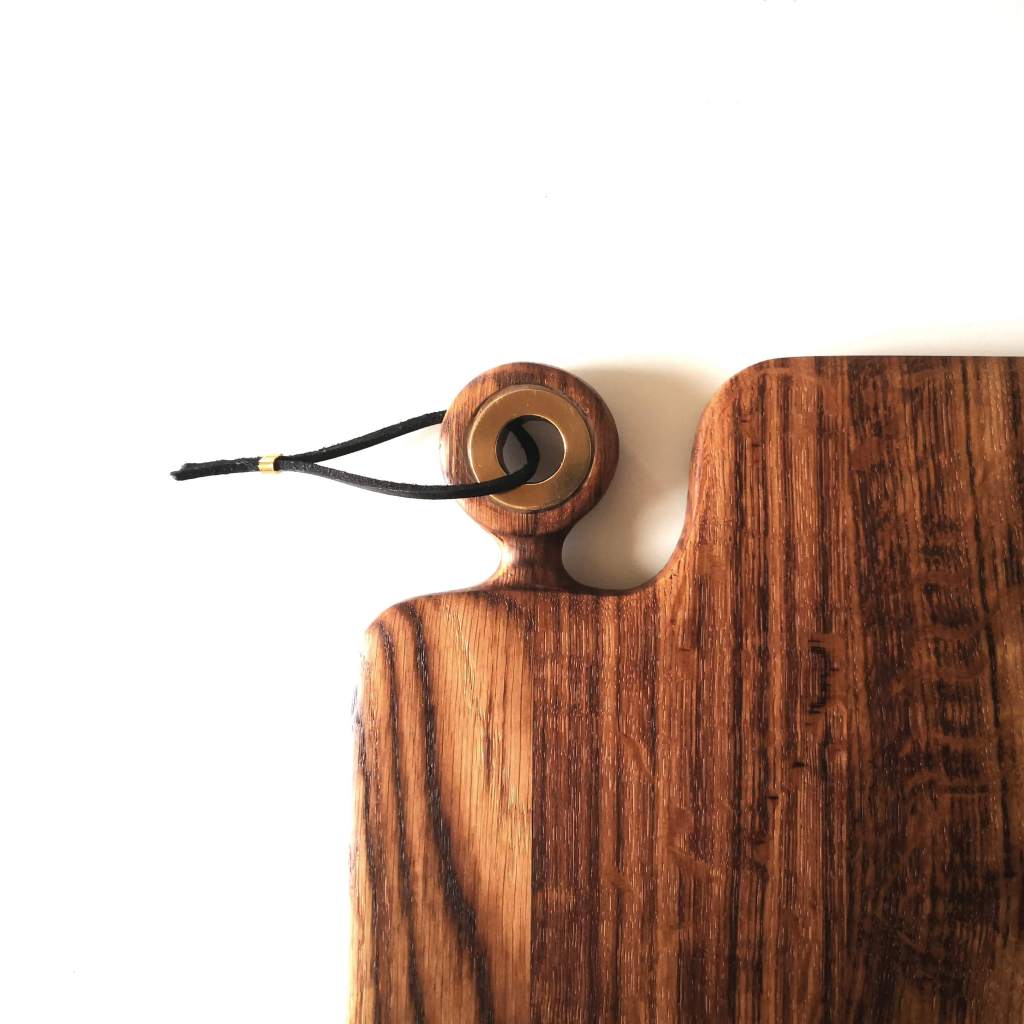 Planche de présentation en chêne massif brun huilé, anneau de laiton incrusté.