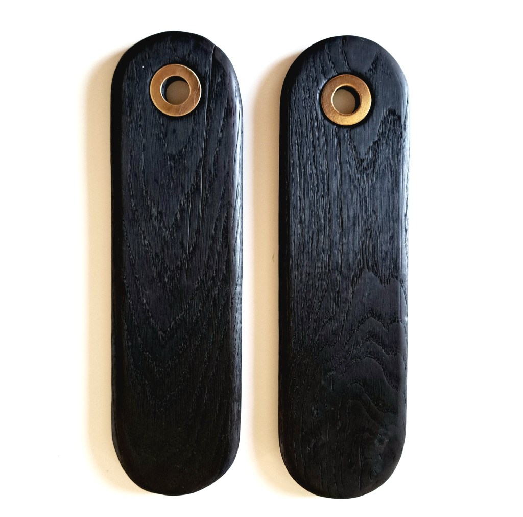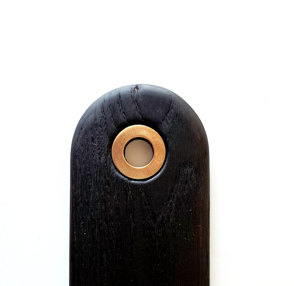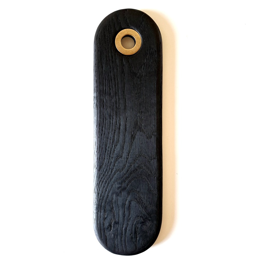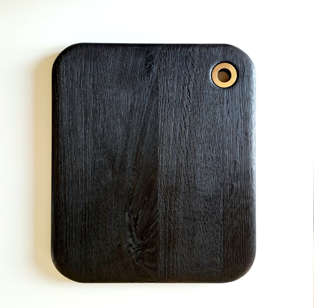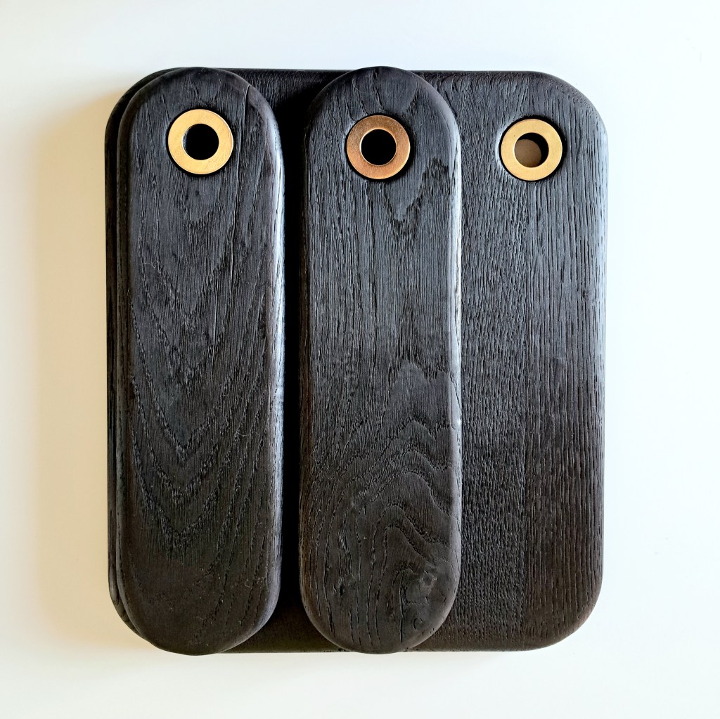 3 Planches épaisses de présentation et découpe en Chêne brûlé. La poignée est incrustée d’un anneau de laiton.